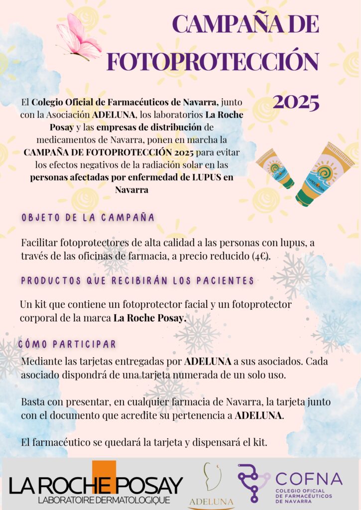 Por séptimo año consecutivo y coincidiendo con el Día Mundial del Lupus, que se celebra este sábado, 10 de mayo, el Colegio Oficial de Farmacéuticos de Navarra (COFNA), junto con La Roche Posay y Adeluna, impulsa la Campaña de Fotoprotección 2025 para que las personas afectadas de lupus en Navarra tengan acceso a fotoprotectores de alta calidad con el fin de protegerlas de los efectos negativos de la radiación solar, a los que son especialmente sensibles.
